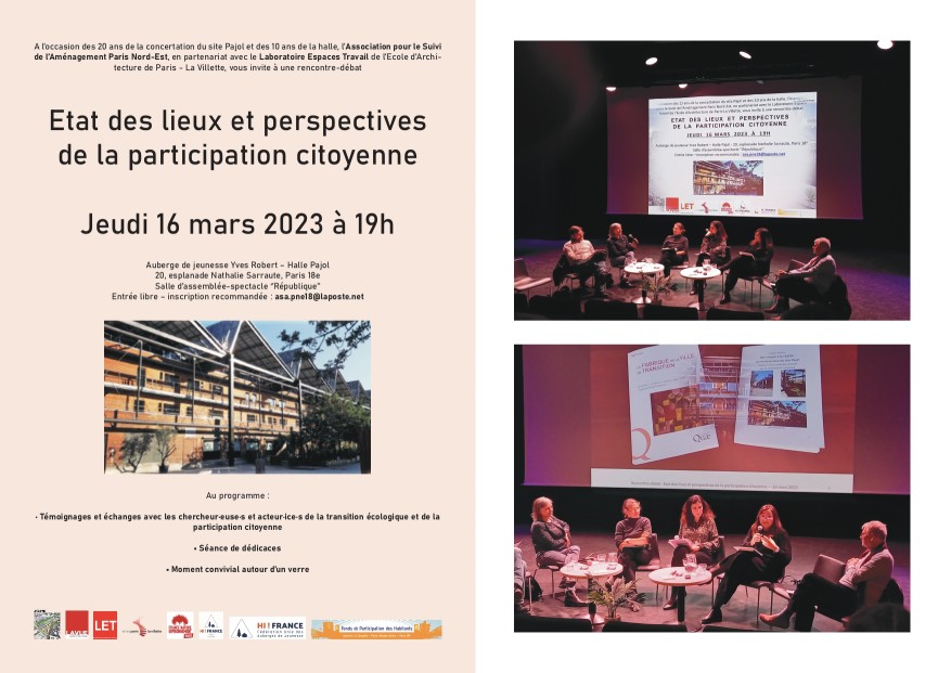 A l’occasion des 20 ans de la concertation du site Pajol et des 10 ans de la halle, l’Association pour le Suivi de l’Aménagement Paris Nord-Est, en partenariat avec le Laboratoire Espaces Travail de l’École d’Architecture de Paris - La Villette, a organisé une rencontre-débat intitulée "État des lieux et perspectives de la participation citoyenne".