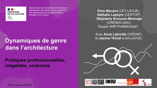 La communication revient sur les principaux résultats de la recherche basés sur l’analyse fine et détaillée d’un ensemble de données issues de la statistique publique mais aussi transmises par les organisations professionnelles, le ministère de la Culture tutelle des ENSA, ou encore produites par le monde de la recherche. Cette sociographie construite à travers le prisme du genre, questionne le processus de féminisation qui présente des zones d’ombre, les dynamiques de carrière, la segmentation des pratiques, les logiques « d’engrenages » qui ont tendance à cantonner les femmes dans certaines positions professionnelles, et le continuum des violences de genre (des inégalités professionnelles aux violences sexistes et sexuelles) qui structure les rapports de genre dans l’architecture.